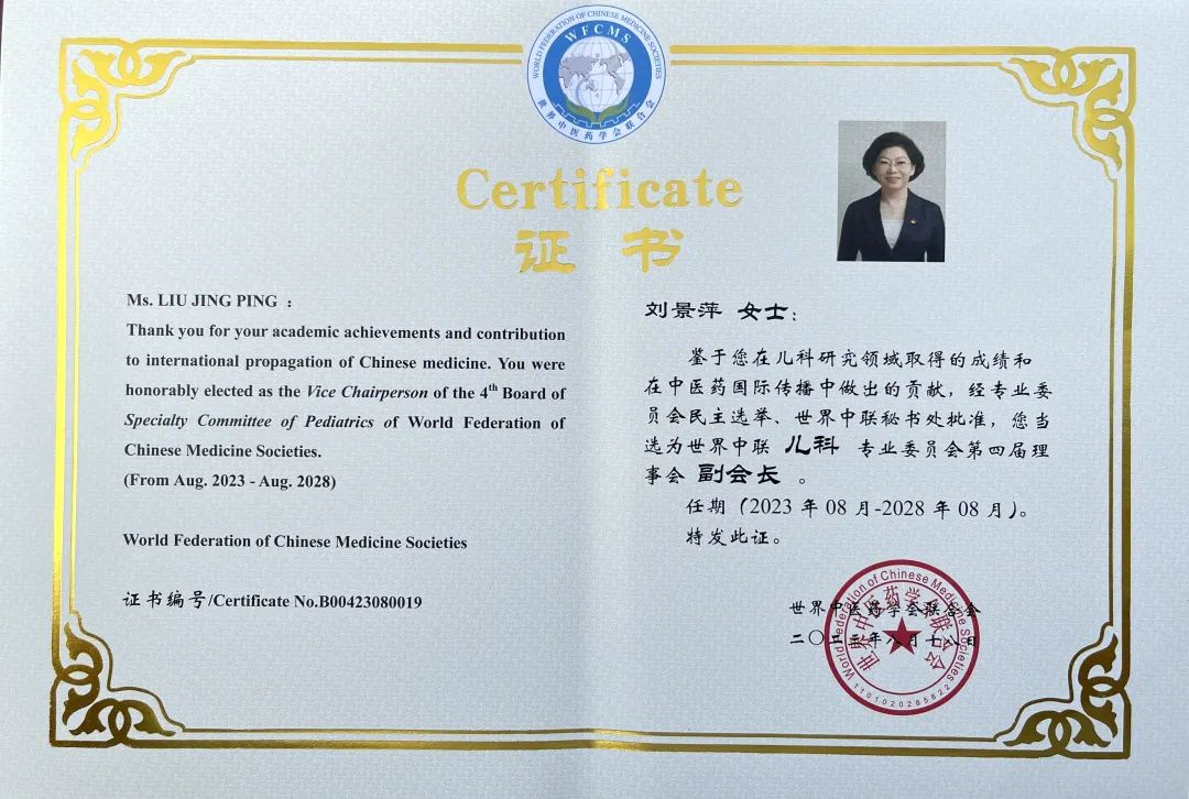 门徒娱乐药业集团党委书记、董事长刘景萍当选世界中医药学会联合会儿科专业委员会第四届理事会副会长